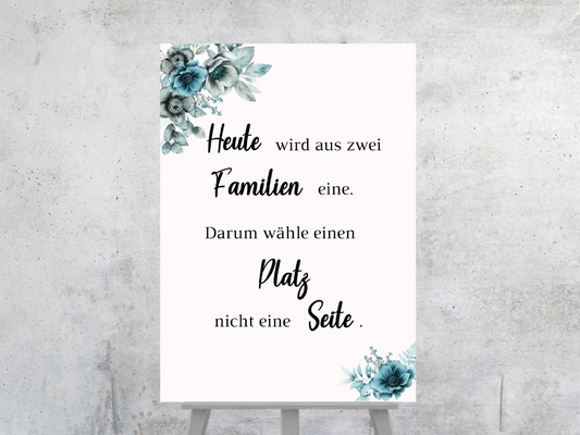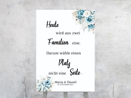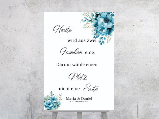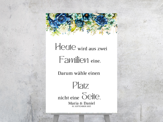 Heute wird aus zwei Familien eine Schild für Hochzeit Leinwand, Poster. Marine , Blaue Blumen JASMIN