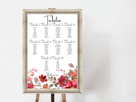 Personalisierter Hochzeits Sitzplan - Leinwand , Poster - Rote Blumen Boho KATRIN
