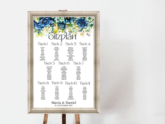 Personalisierter Hochzeits Sitzplan - Leinwand , Poster - Marine , Blaue Blumen JASMIN